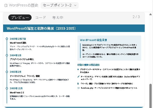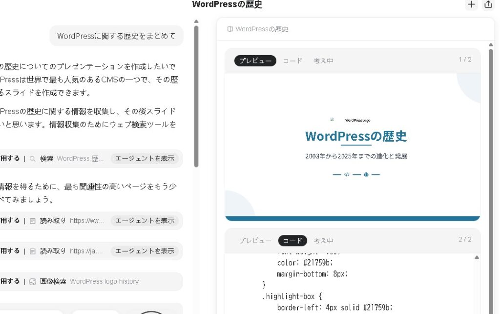 たとえば「◯◯◯の歴史をまとめて」と入力するだけで、要点をおさえたスライドが数分で完成します。