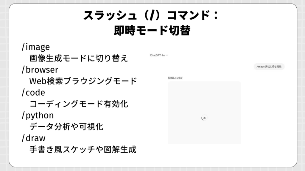 /image… 画像生成モードへ即切替/browser… ブラウジングモード(Web検索モード)へ即切替/code… コーディングモードを有効化/python… Pythonツールを有効化してデータ分析や可視化に便利/draw… 手書き風スケッチや図解生成モードに移行
