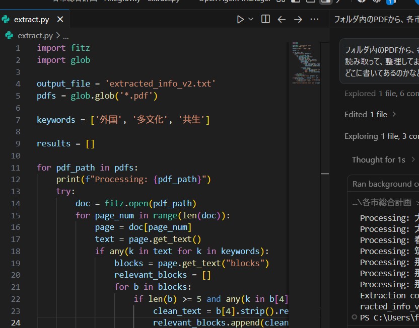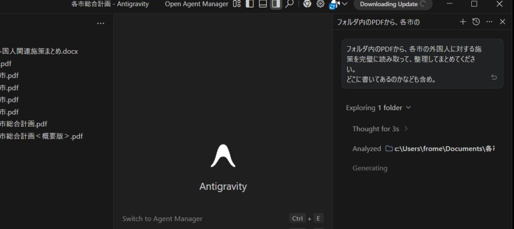 フォルダ内のPDFを要約し、資料にまとめる。Google Antigravityは、AIに単発で質問するだけのツールではありません。ローカル環境で作業フォルダを開き、AIエージェントにまとまった仕事を任せるための「エージェント型開発環境」として設計されています。