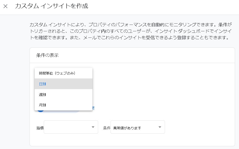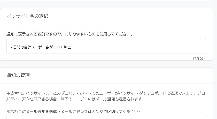 カスタム インサイト: 重要なデータの変化を検出する条件を作成します。条件がトリガーされると、インサイト ダッシュボードにインサイトが表示されます。メール通知アラートが届くように設定することもできます。プロパティごとに最大 50 個のカスタム インサイトを作成できます。