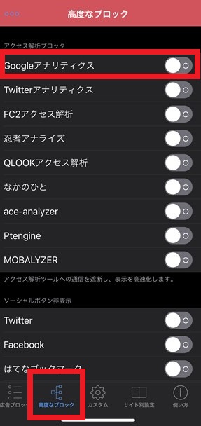 次に、「AdFilter」のアプリ上で「高度な設定」を開いて「Googleアナリティクス」を「ON」にします。