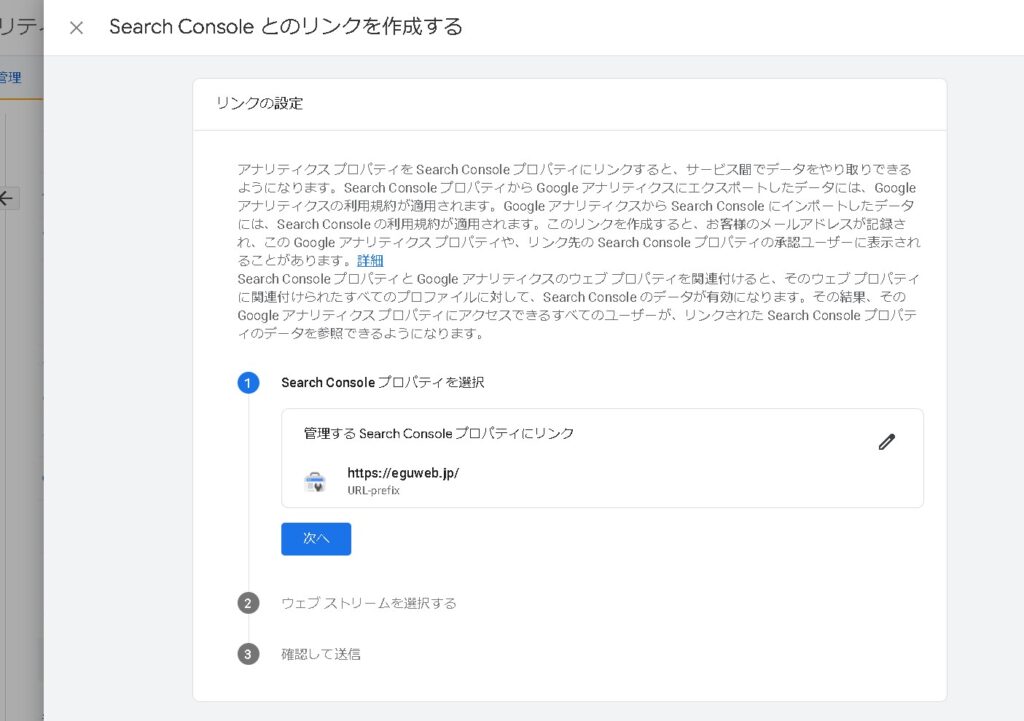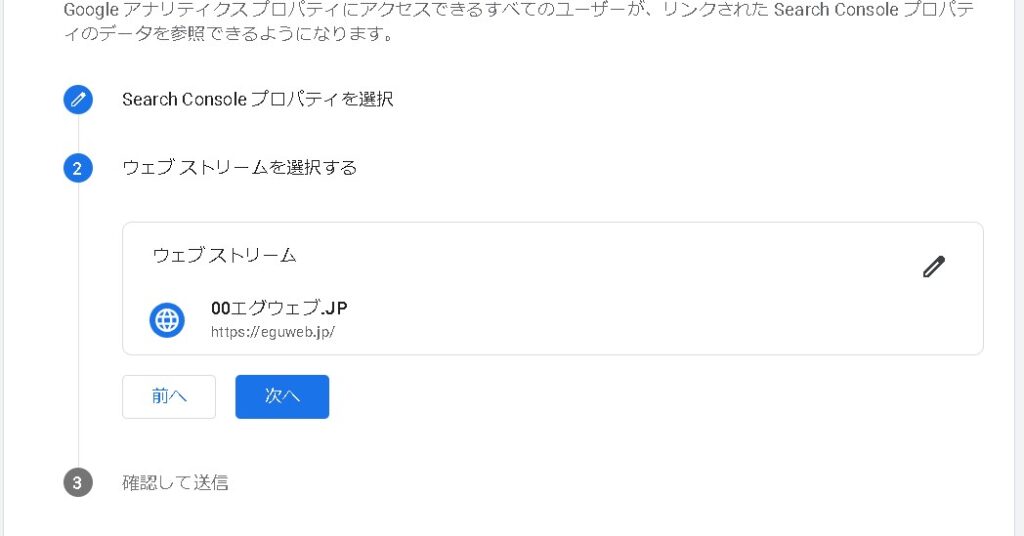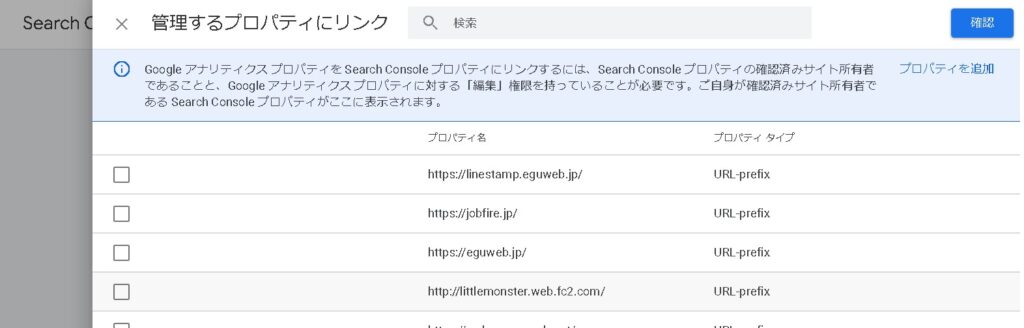 アカウントと接続したいドメイン(プロパティ名)を選択して「確認」を押します。