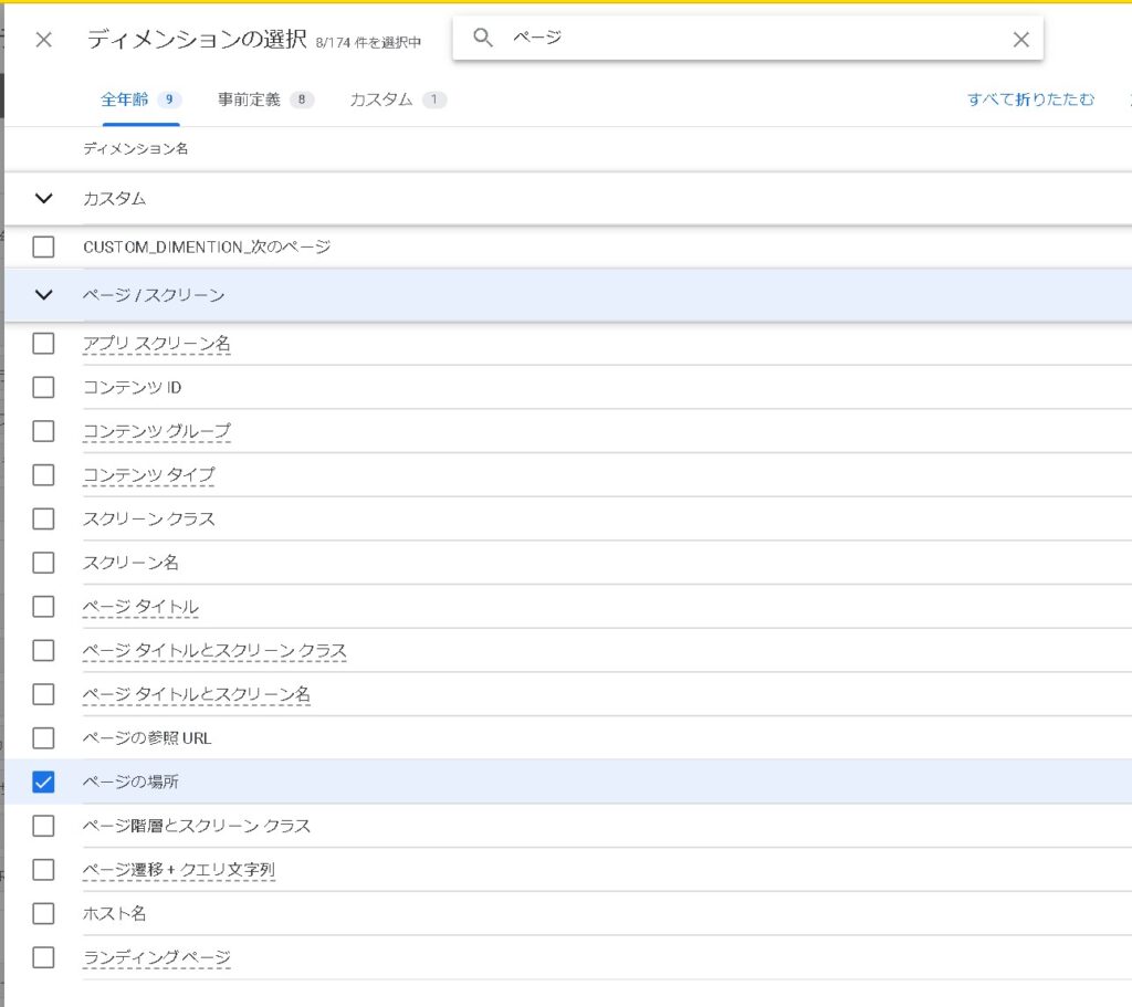 ディメンションを追加します。「ページの場所」を追加します。「ページ」など検索すると候補に出てくるかと思いますので、チェックを入れてインポートします。
