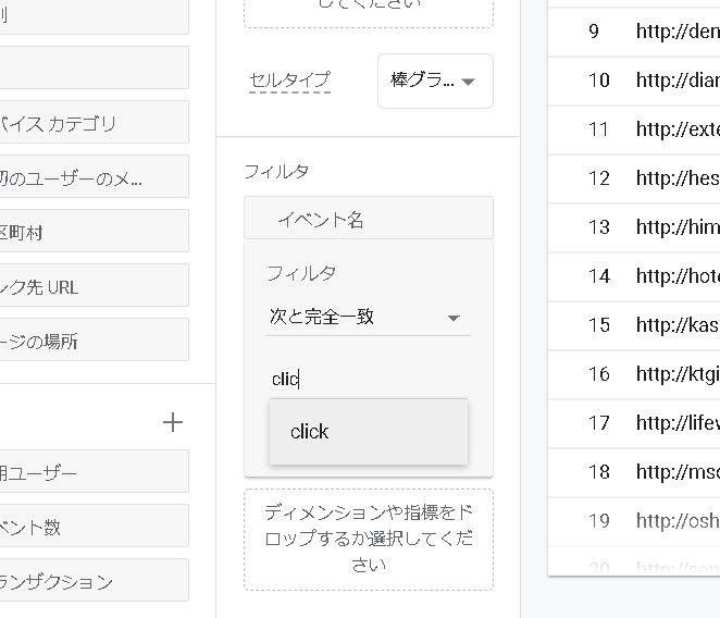 イベント名のフィルタを追加したら「click」イベントと一致させます。