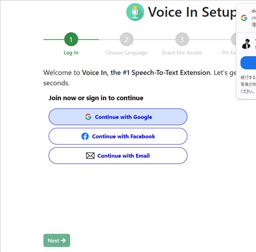Voice Inをインストール後、アカウントにログインします。Googleアカウントとの連携も可能ですので、スムーズに設定を進められます。