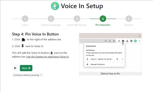 ブラウザの拡張機能アイコン(パズルのピースのような形)をクリックし、Voice Inのアイコンをピン留めすることをおすすめします。
