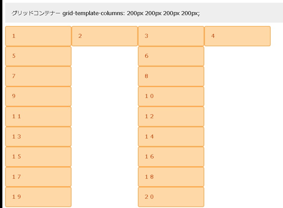 grid-template-columns:で前のページの状態で6個以上になった場合、6個目以降は2列目と4列目に並ぶようになります。