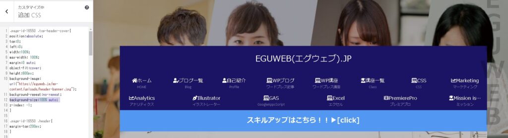 ということで「background-size:」を使って「100% auto;」の指定をしてあげることで、横幅いっぱいに広がった状態にできます。
