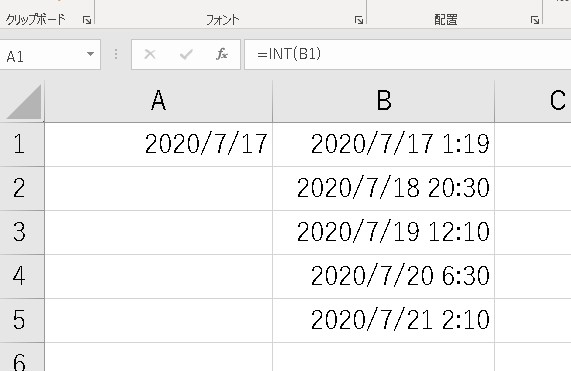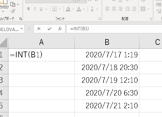 【EXCEL】年月日と時間が入っているセル(タイムスタンプ)から時間を消して日付を表示させる方法|INT関数