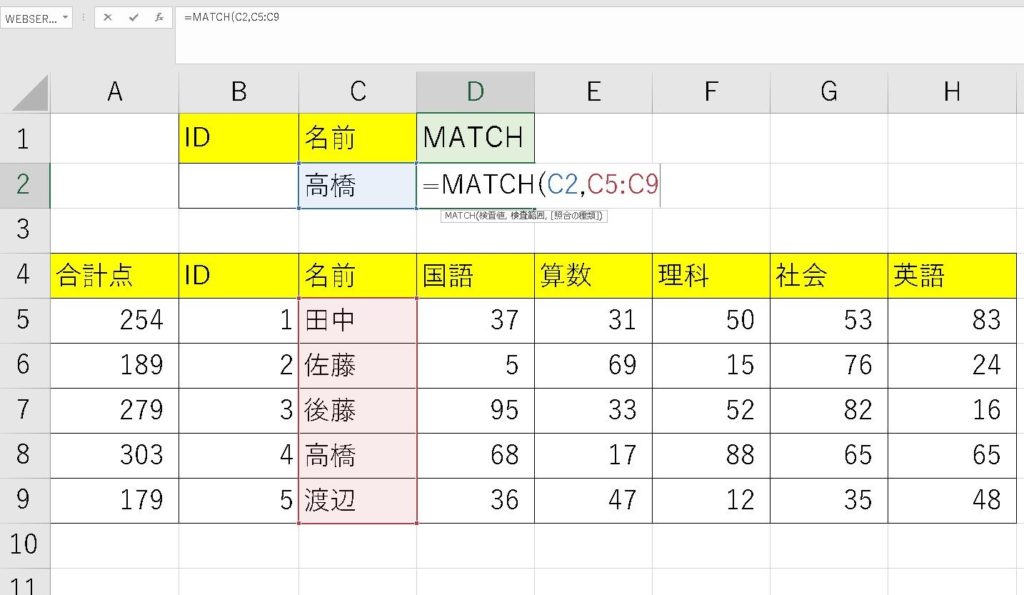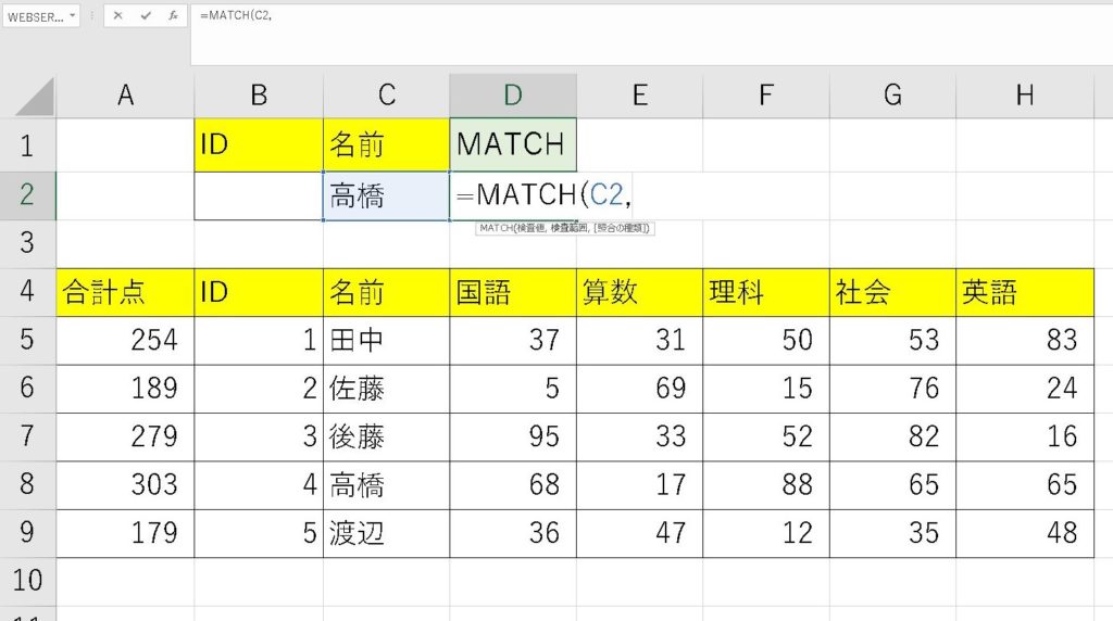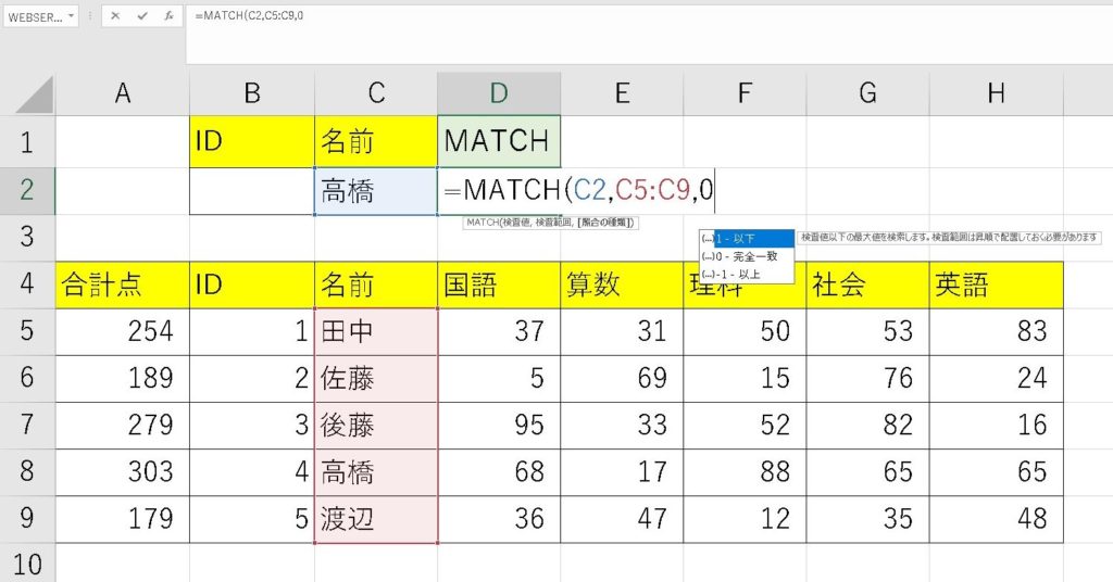 「=MATCH(検索値, 検索範囲, [照合の種類])」