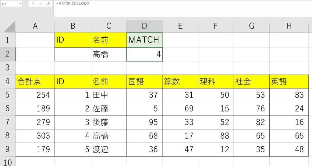 つまり、この場合は「高橋」さんが範囲の「4番目」にある、ということがわかります。