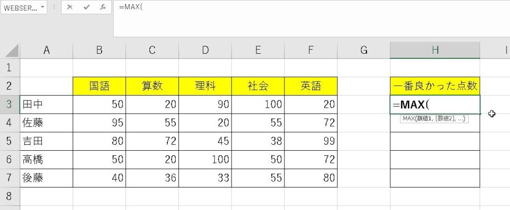使い方は簡単です。まずは=MAXとセルに入力して、()の中に範囲を指定します。