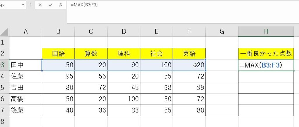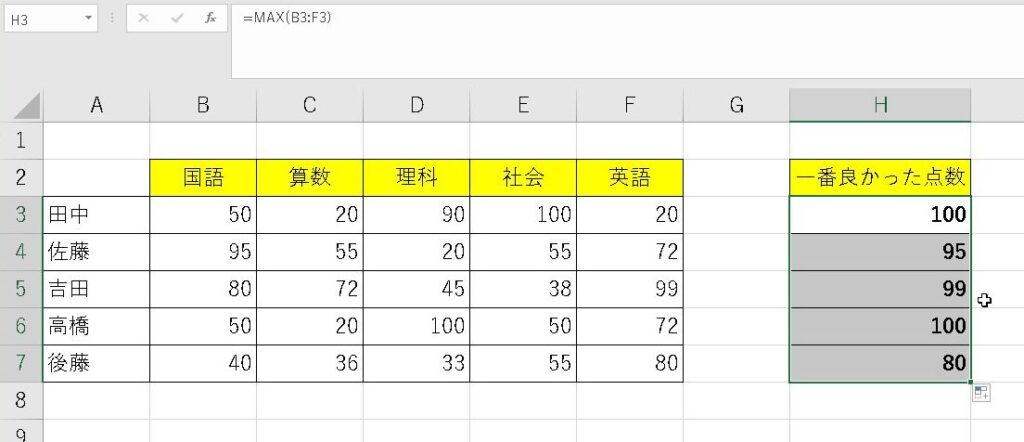 そうすると「範囲の中から一番数値の大きな結果」が表示されます。あとは、下までオートフィルすれば、範囲がずれていくので、今回の場合は、それぞれの学生の「一番良かった点数」が表示されます。