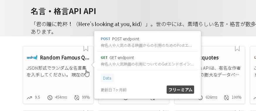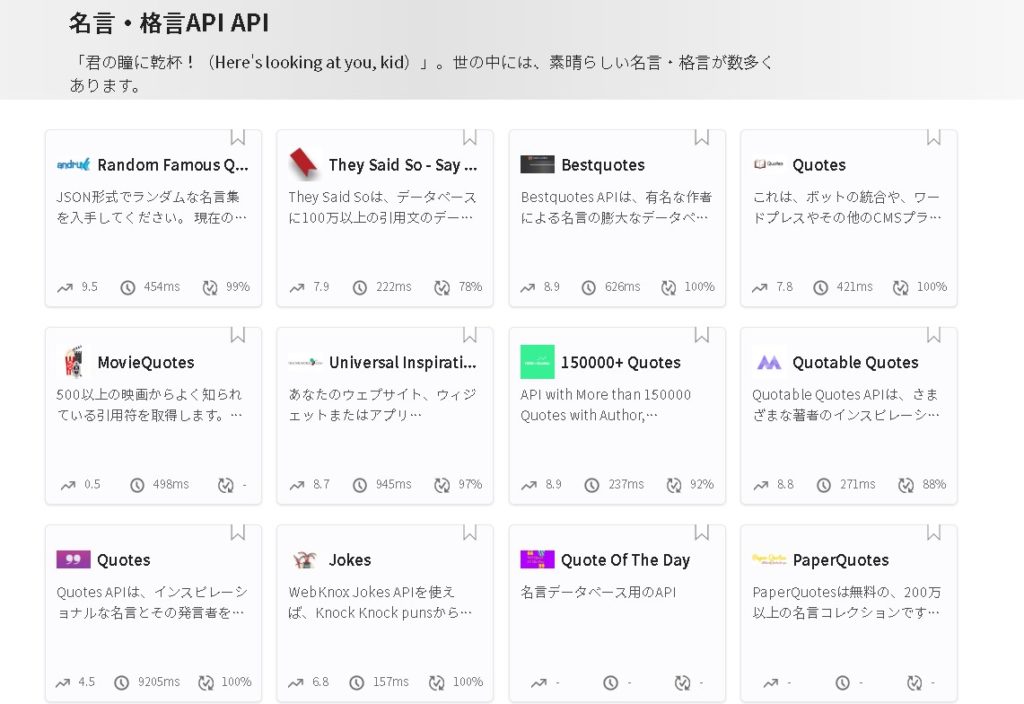 ということで、Googleシートに名言リストを作成して…と思いましたが、名言APIみたいなものは無いかな…?と思ったところ、ありました。