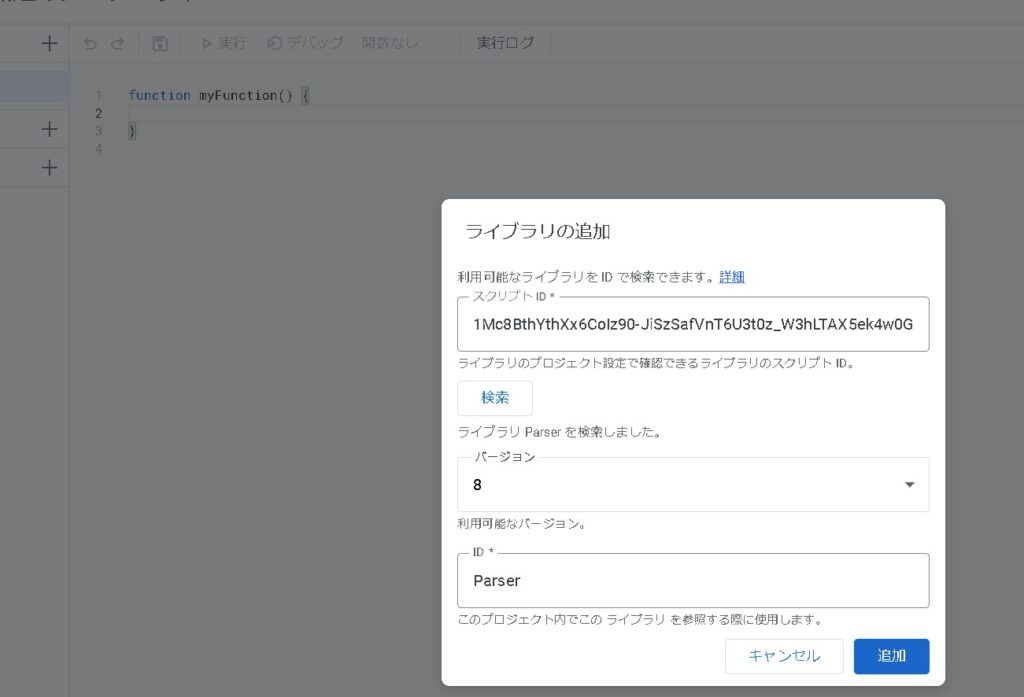 スクリプトIDを入れて検索をかけると「Parser」という便利なライブラリが追加できます。