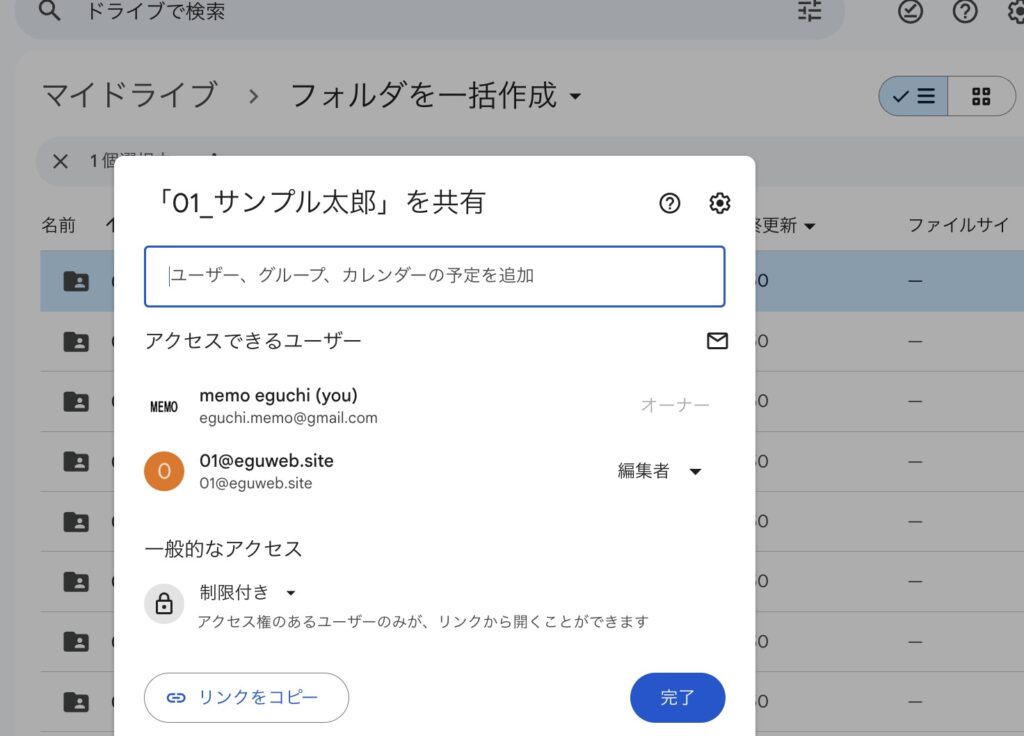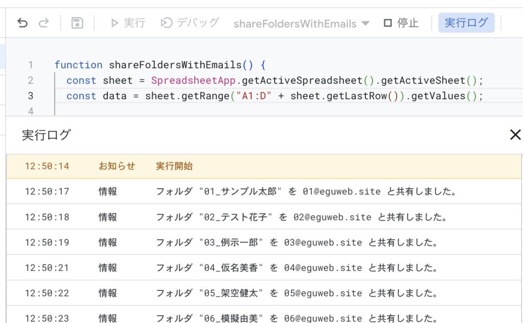 このスクリプトを使用することで、指定されたフォルダに対して対応するメールアドレスに共有権限を効率的に設定することができます。