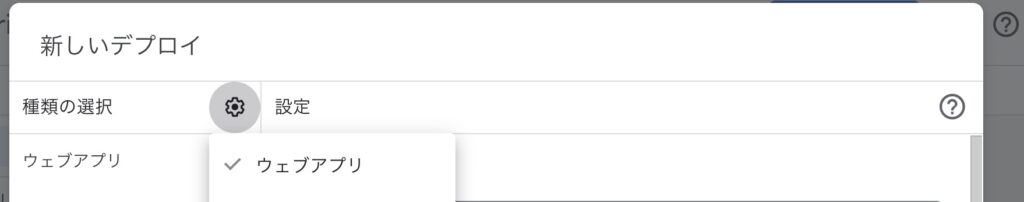 「ウェブアプリ」を選択し、実行するユーザーとアクセスできるユーザーを設定します。通常、「自分として実行」と「全員にアクセス許可」を選択します。