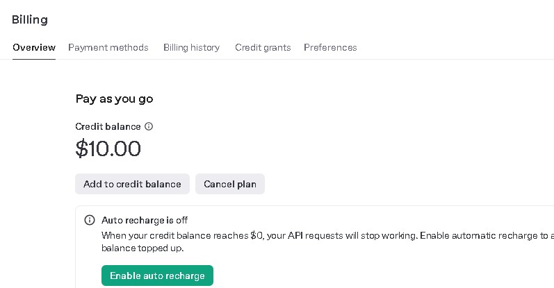 APIのCreditが$0になった場合はAPIが実行できないので、チャージが必要です。