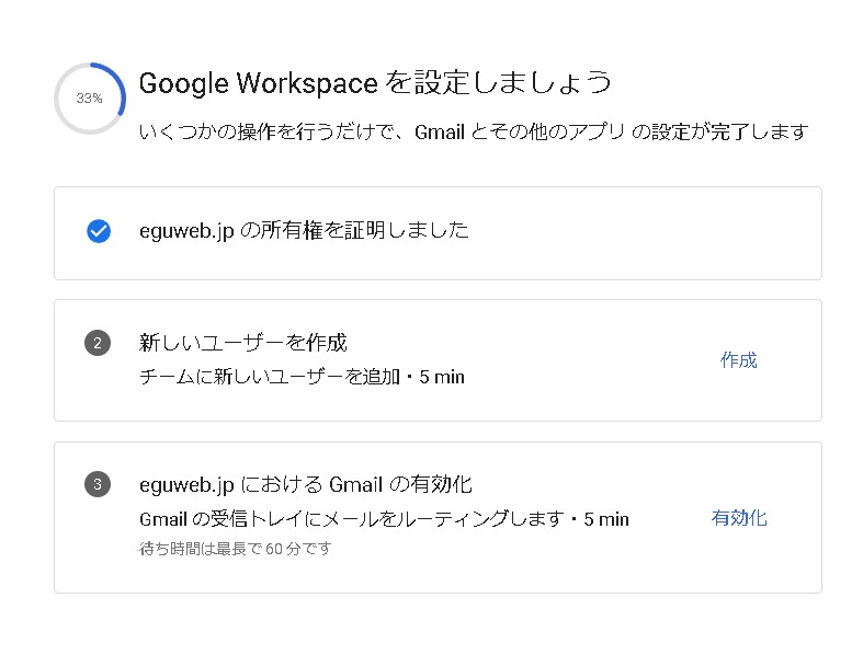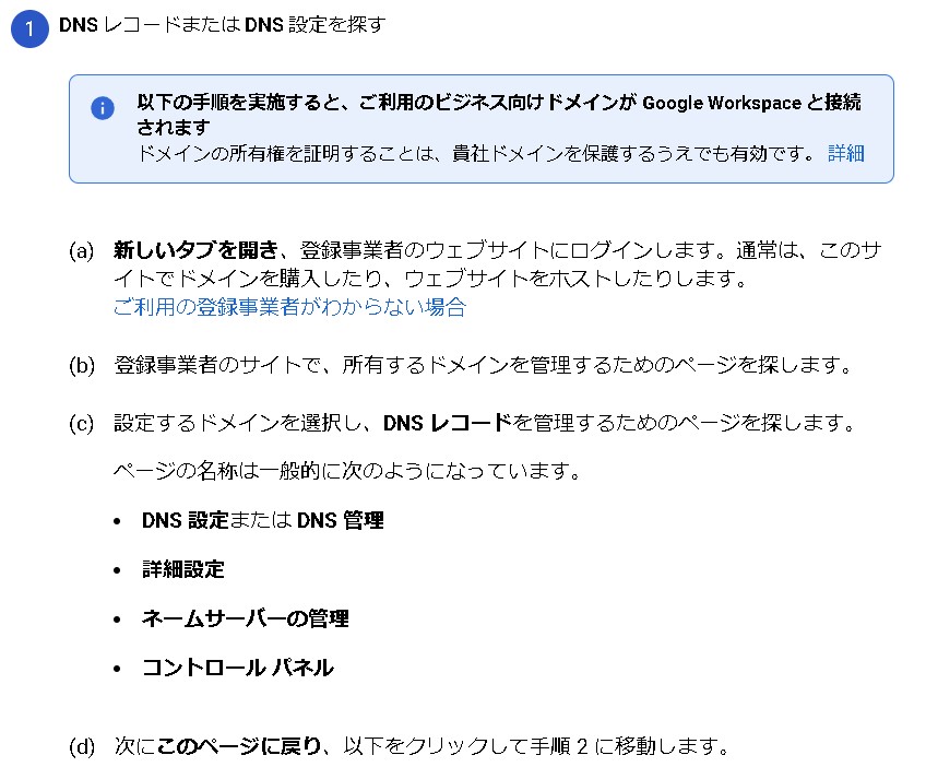 以下の手順を実施すると、ご利用のビジネス向けドメインが Google Workspace と接続されます