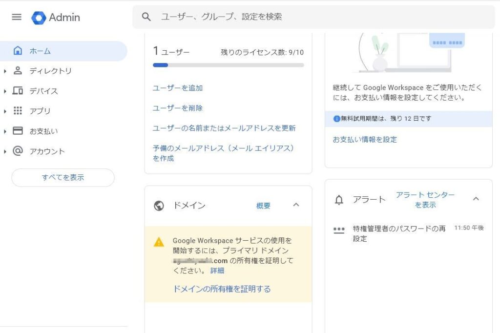 管理画面のドメインの部分に「Google Workspace」サービスの使用を開始するには、プライマリドメインXXXXXXXX.comの所有権を証明してください。と表示されています。