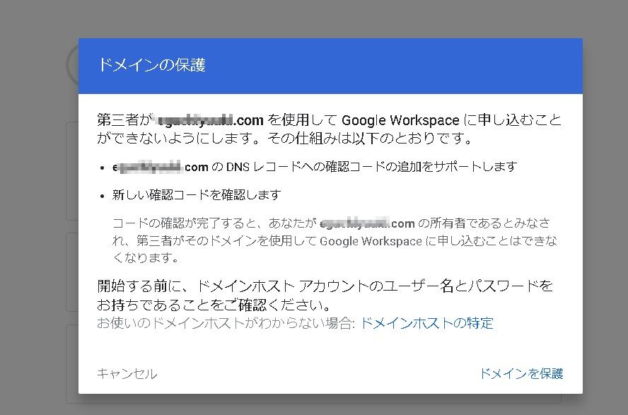 Google Workspace サービスの使用を開始するには、プライマリ ドメイン XXXXXXX.com の所有権を証明してください。