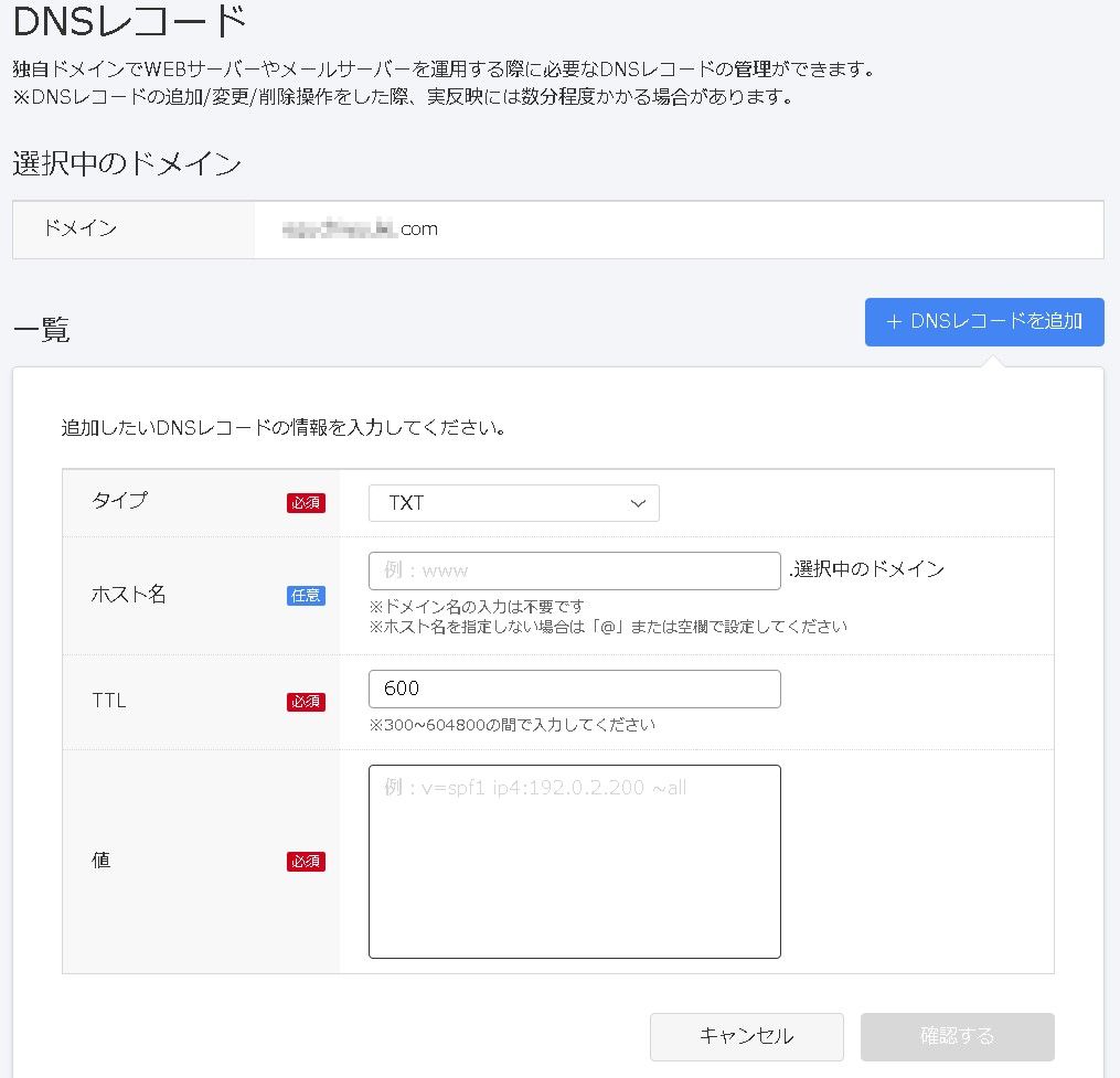 以下はお名前ドットコムの設定画面でTXTレコードを追加する例です。※設定を誤ると、とても大変なことになりますので設定は重々注意ください。