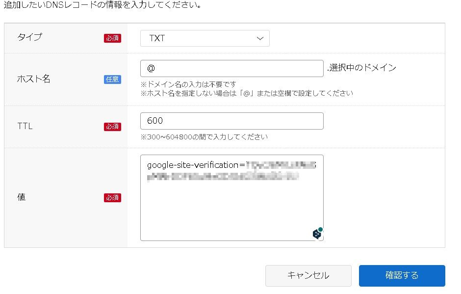 GOOGLE-SITE-VERIFICATION=XXXXXXXXXXXXXXXXXXXXXXX登録事業者のウェブサイトで、新しい TXT レコードを作成します。