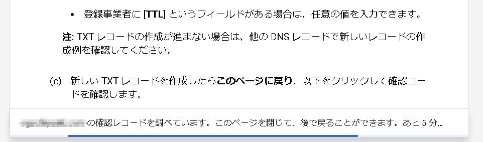 注: TXT レコードの作成が進まない場合は、他の DNS レコードで新しいレコードの作成例を確認してください。(c)新しい TXT レコードを作成したらこのページに戻り、以下をクリックして確認コードを確認します。