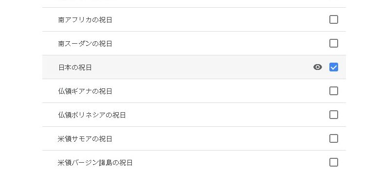 世界各国の祝日がずらっと並びます。その中に「日本の祝日」がありますのでチェックをいれます。