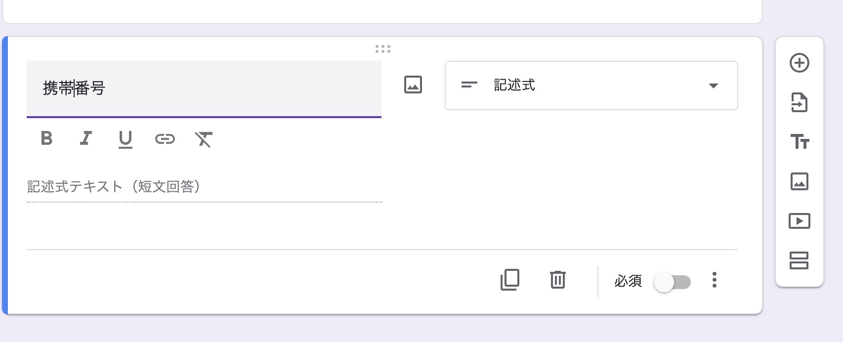 例えば、携帯電話番号を入力してもらいたい場合に、標準の記述式では、フリーに何でも入力できてしまいます。