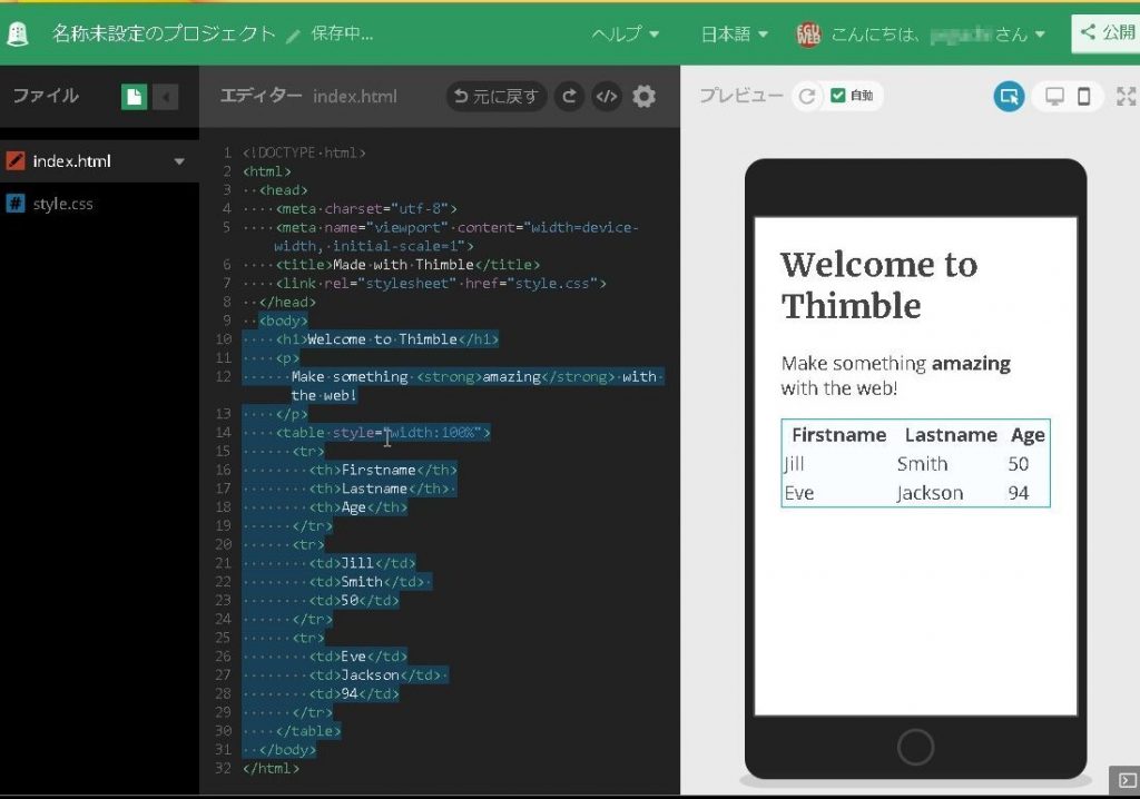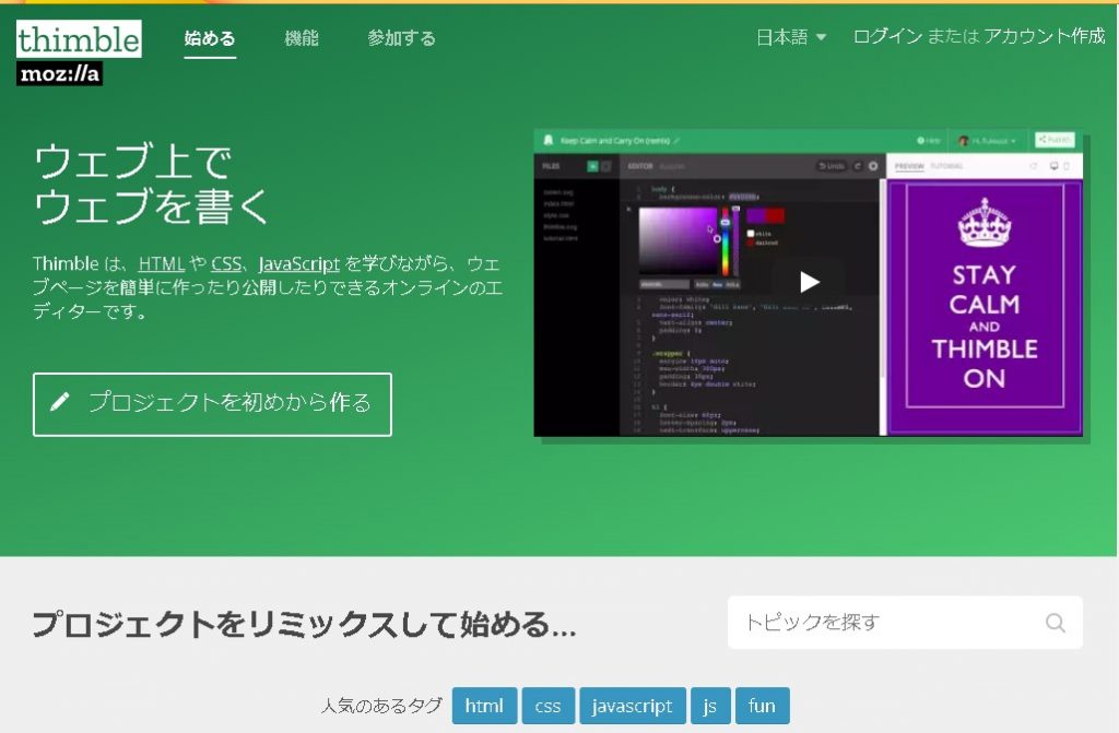 Thimble は、HTML や CSS、JavaScript のコードをWebブラウザの上で書く・学ぶことが出来るmozilla製の無料HTML・CSSエディターです。