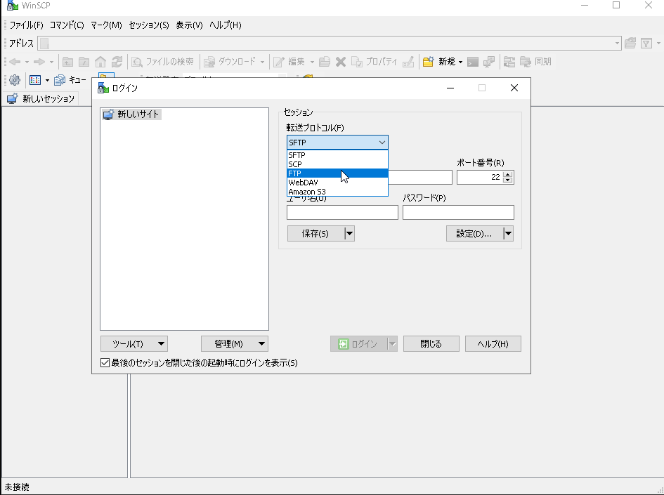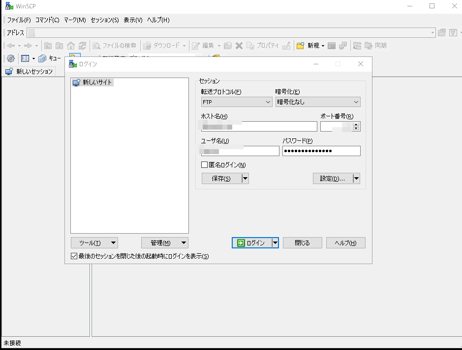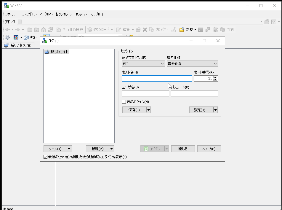 WinSCPを開くと、ログイン画面が表示されます。