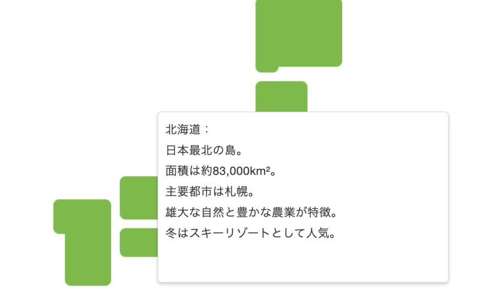 このサンプルコードでは、地図の画像上に、北海道(長方形)、東京(円)、大阪(多角形)といった3つのクリック可能な領域を作成しています。実際の使用時は、画像のサイズや内容に合わせて座標を適切に調整する必要があります。