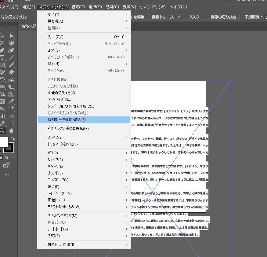 オブジェクト>「透明部分を分割・統合」を選択します。