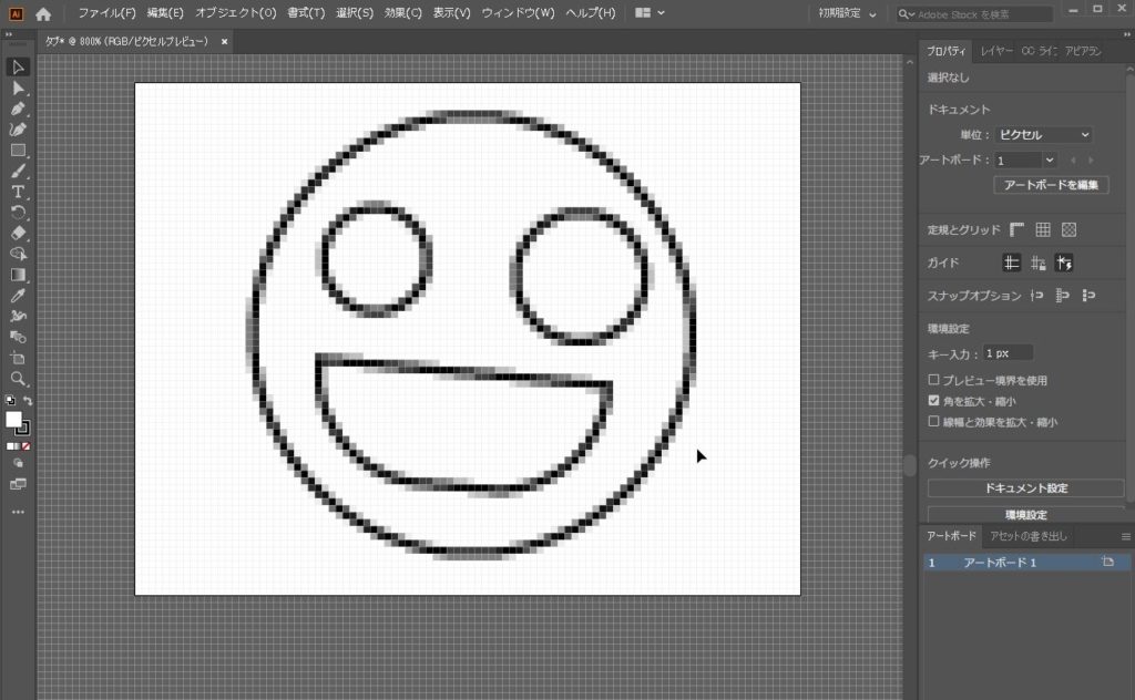 ピクセルプレビューに表示を切り替えて丸を描いてみると・・・