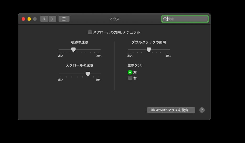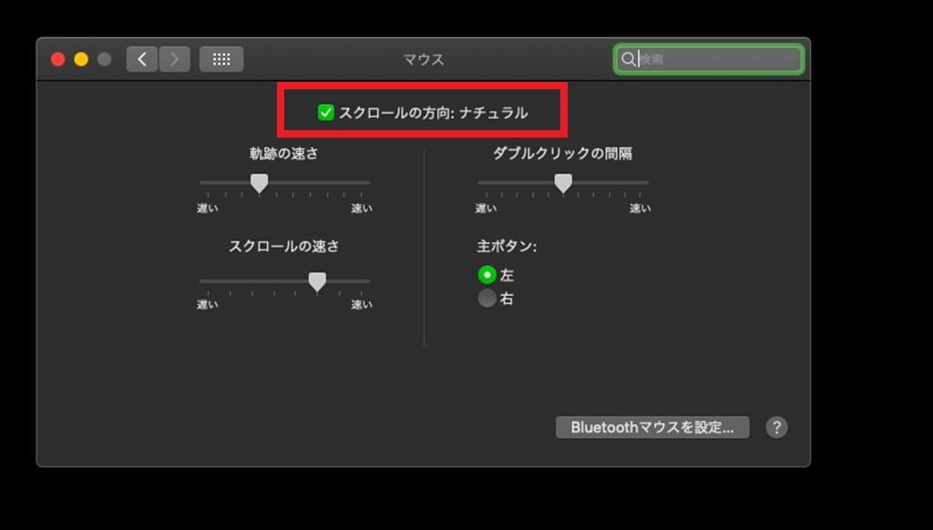 「スクロールの方向:ナチュラル」これがスクロール向きの設定方法です。