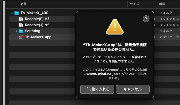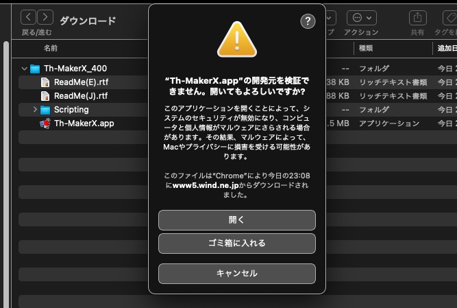 ダウンロードしたzipファイルを解凍します。解凍したフォルダの「Th-MakerX.app」というファイルをアプリケーションフォルダに移動して、開きます。