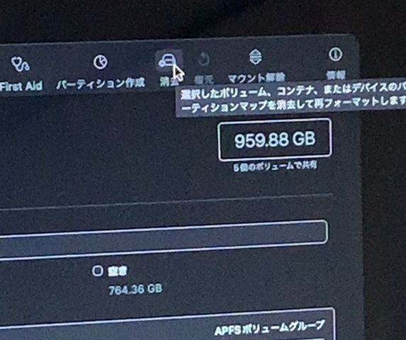 名前を選択できますが、そのままで大丈夫です。フォーマットはAPFSにしたままにしておきます。消去したら全てが消えるので、慎重に進めましょう。