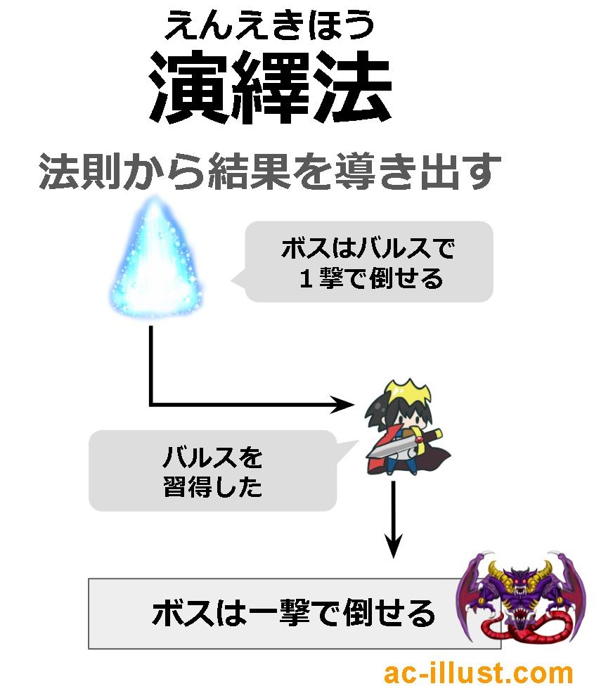 普遍的な前提から、より個別的な結論を得る論理的推論のことを「演繹法(えんえきほう)」といいます。別名「三段論法(さんだんろんぽう)」とも言われます。デカルトが哲学の方法論として創始したそうです。