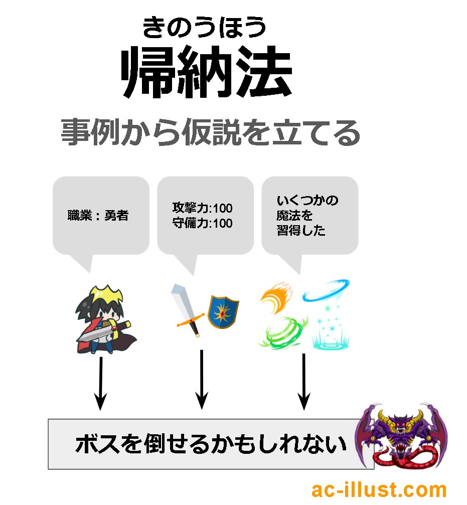 個別的な事例から一般的な規則・法則を見出す論理的推論の方法のことを「帰納法(きのうほう)」といいます。別名「帰納的推論(きのうてきすいろん)」と言われています。