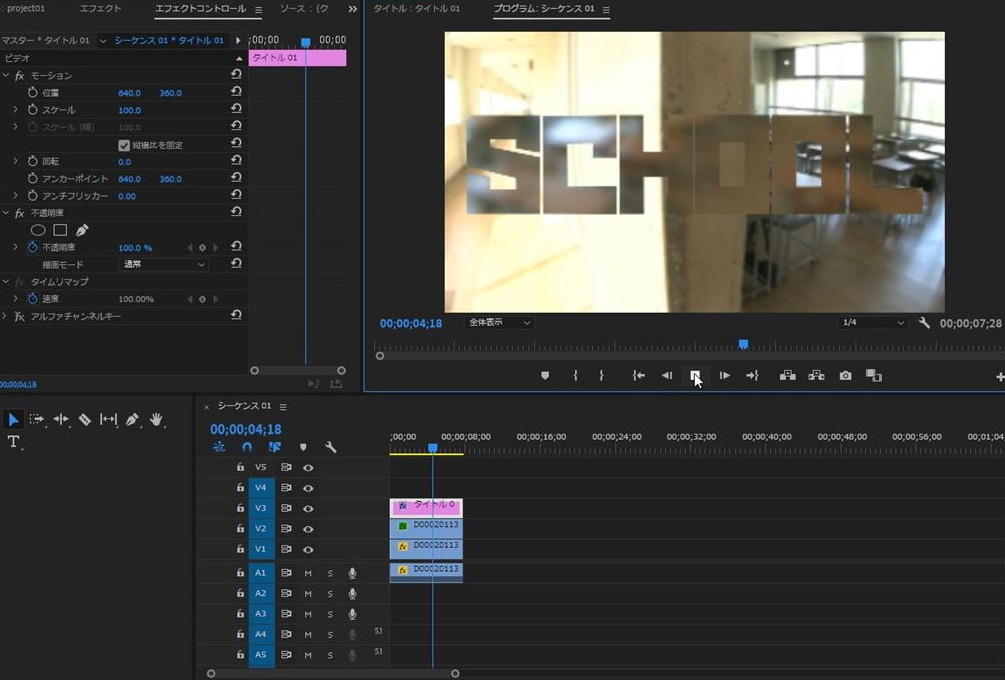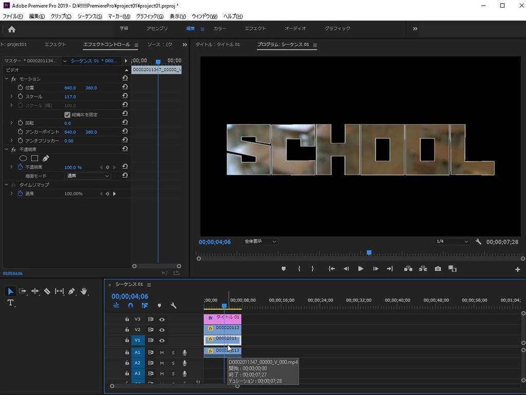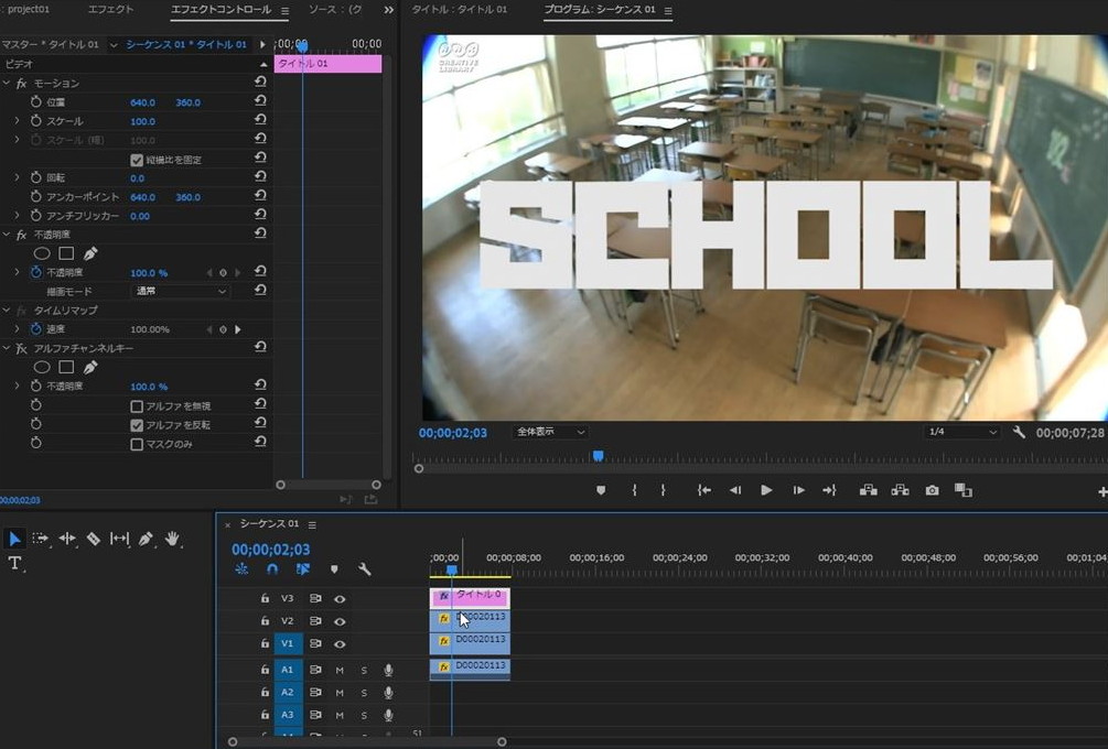 例えば、合成した文字の下に別の動画があり、文字の外側は映像を重ねたい、という場合には、「トラックマットキー」を使います。