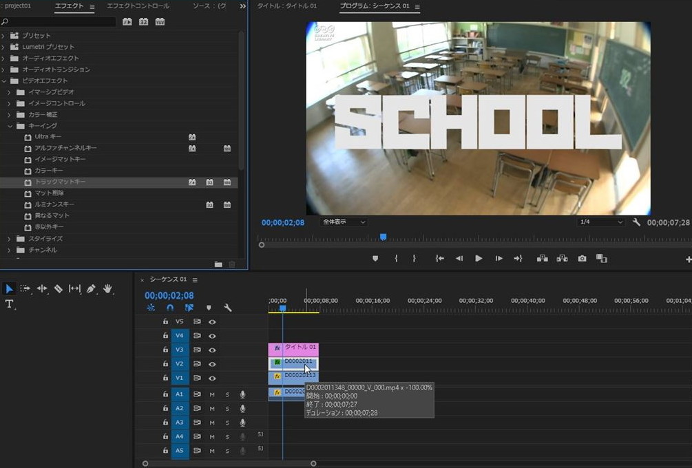 「エフェクト」>「キーイング」から「トラックマットキー」を選択して、真下の動画にドラッグアンドドロップ。エフェクトをかけます。