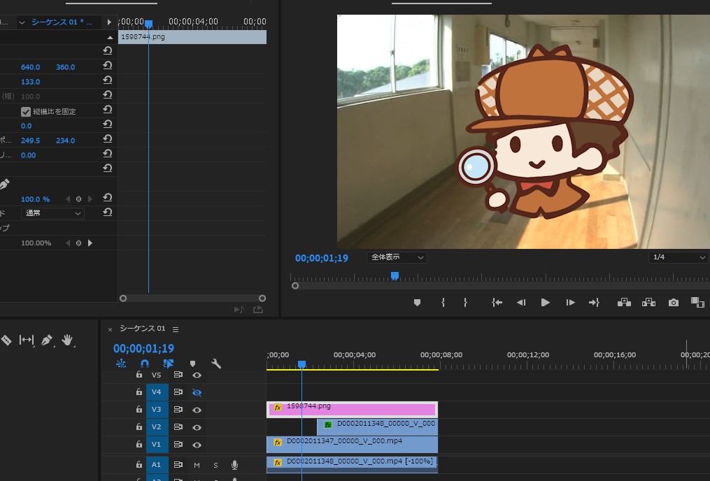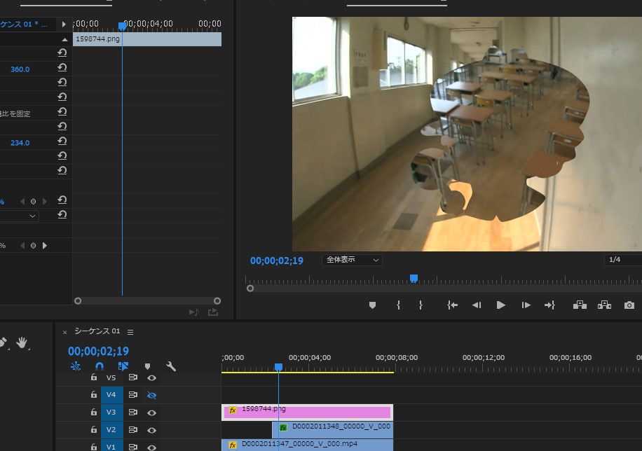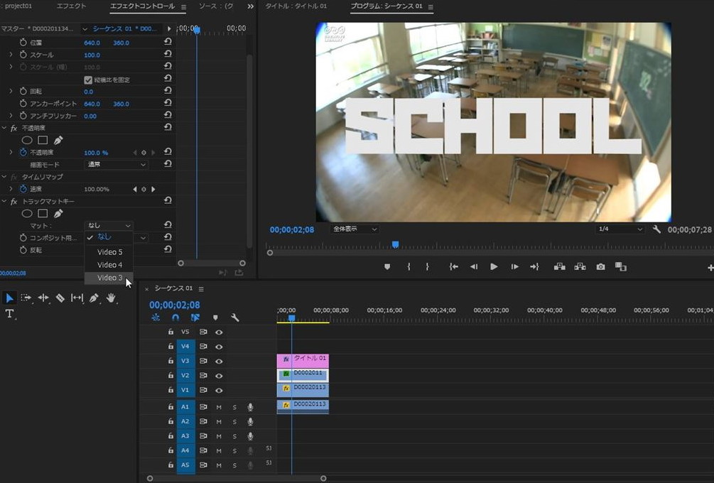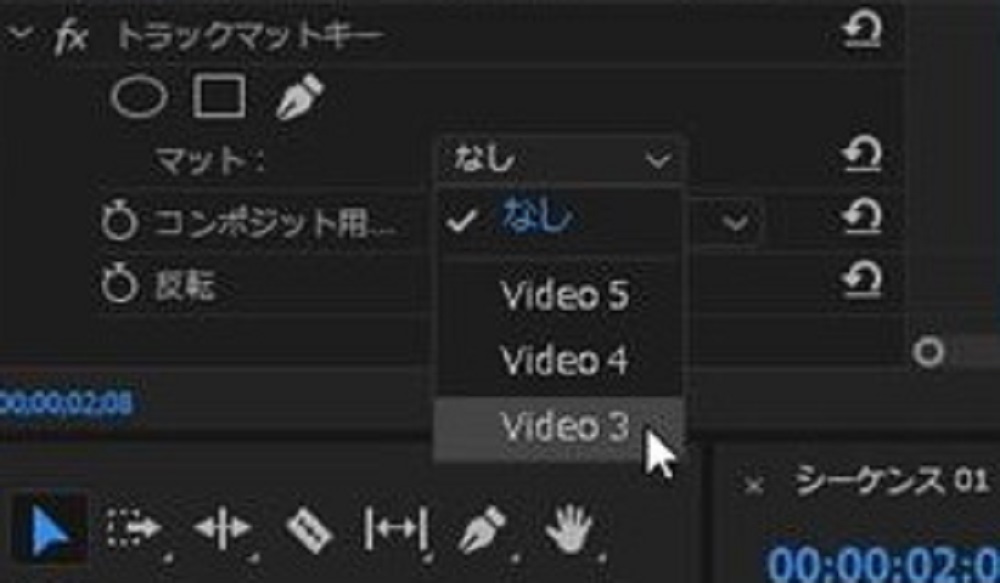 そうすると、トラックマットキーのエフェクト内の「マット」から「video3」 「video4」 「video5」 など(そのトラックの上にあるトラック)が選択できるようになりますので、今回の場合だと、真上にあるvideo3(V3)を選択します。