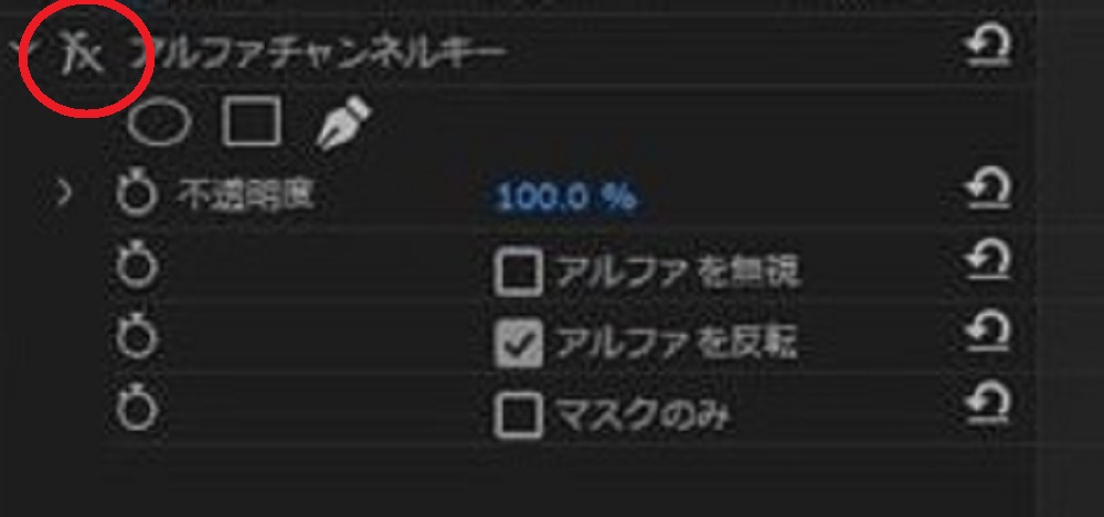このままだとアルファチャンネルが掛かったままになってしまいますので、まずは、アルファチャンネルを解除(エフェクトのオフ)します。