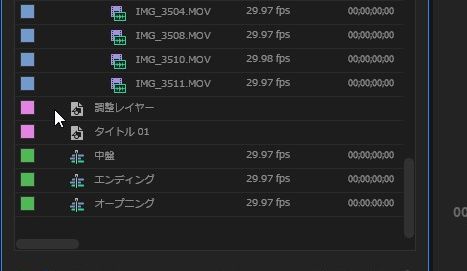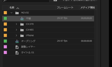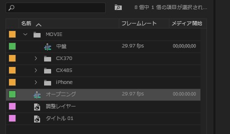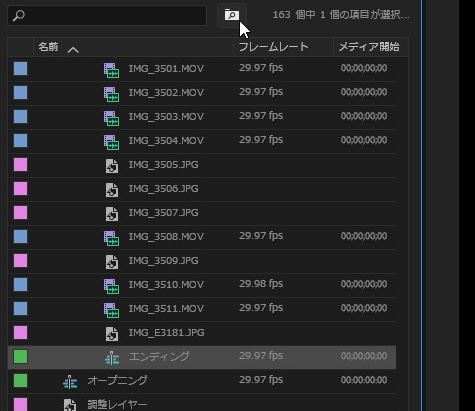 という感じで、検索ビンを使うと、あちこちにちらばったシーケンスや動画データ、レガシータイトルなどを、まとめて表示させることができるので便利です!