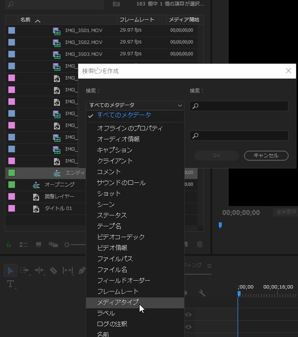 「メディアタイプ」を選択して、検索枠に「シーケンス」と入力してOKを押します。