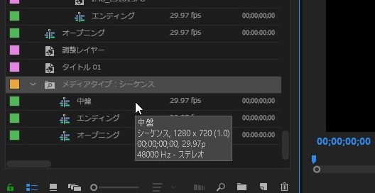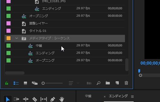 すると、プロジェクトパネルの下に「メディアタイプ:シーケンス」という検索ビンが追加されて、そこには「シーケンス」がまとまって表示されます!!