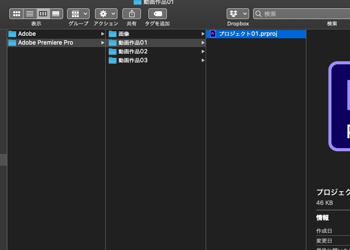 プロジェクトを新規作成すると、新規作成時に指定したフォルダに「XXXXX(ファイル名).prproj」というファイルが、作られます。