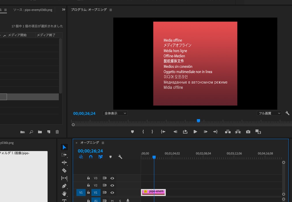 素材を取り込んだあとに、取り込んだ「素材のファイル名を変える」「フォルダ名を変える」「フォルダを移動する」を行うと、「次のクリップのメディアがありません」と警告が出てしまい、オフラインを選択して無視するか、検索して再リンクするか、などになってしまいます。