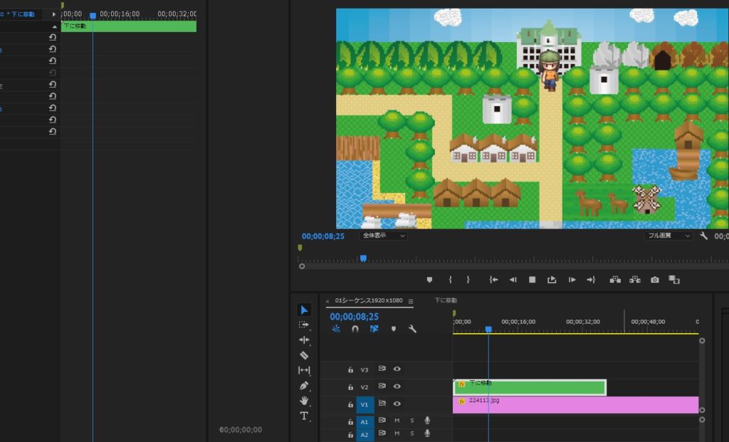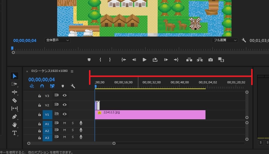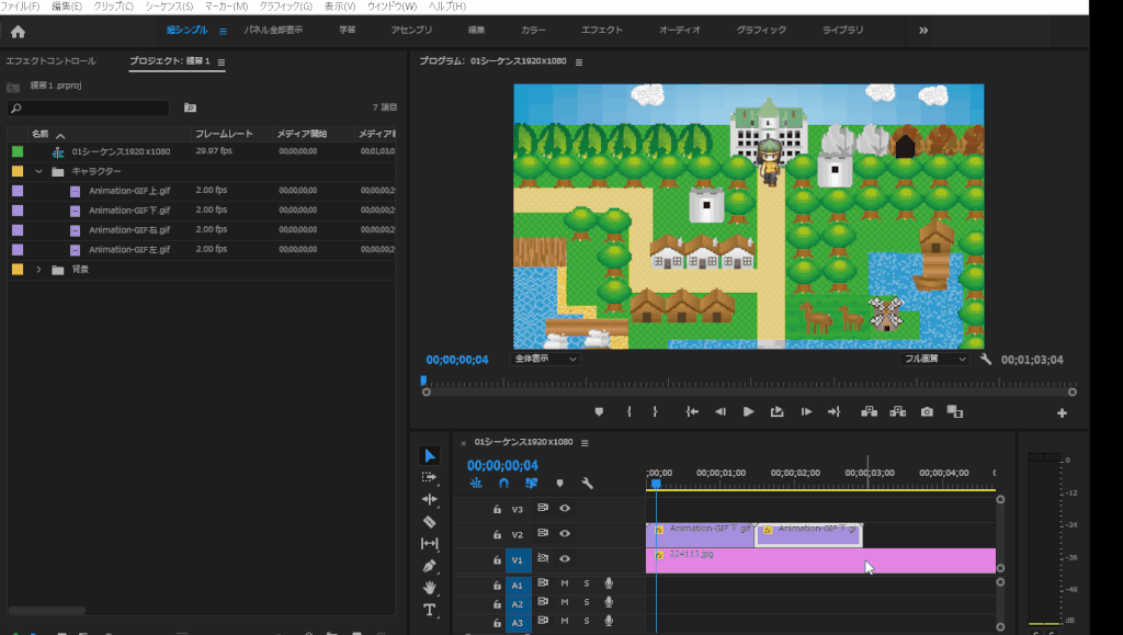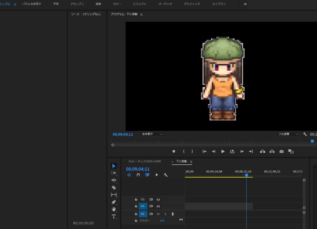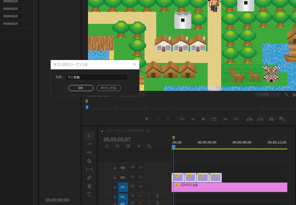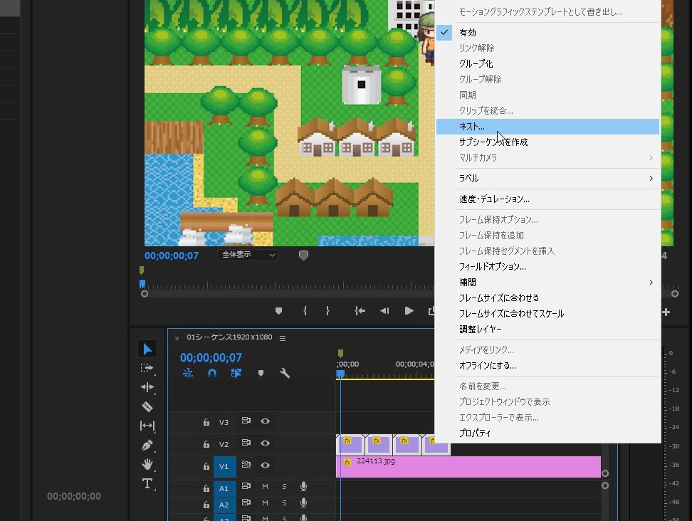 ひとまず、突っ込んだクリップ(キャラクターの方のトラック)を選択して、右クリック>「シーケンスのネスト」化します。